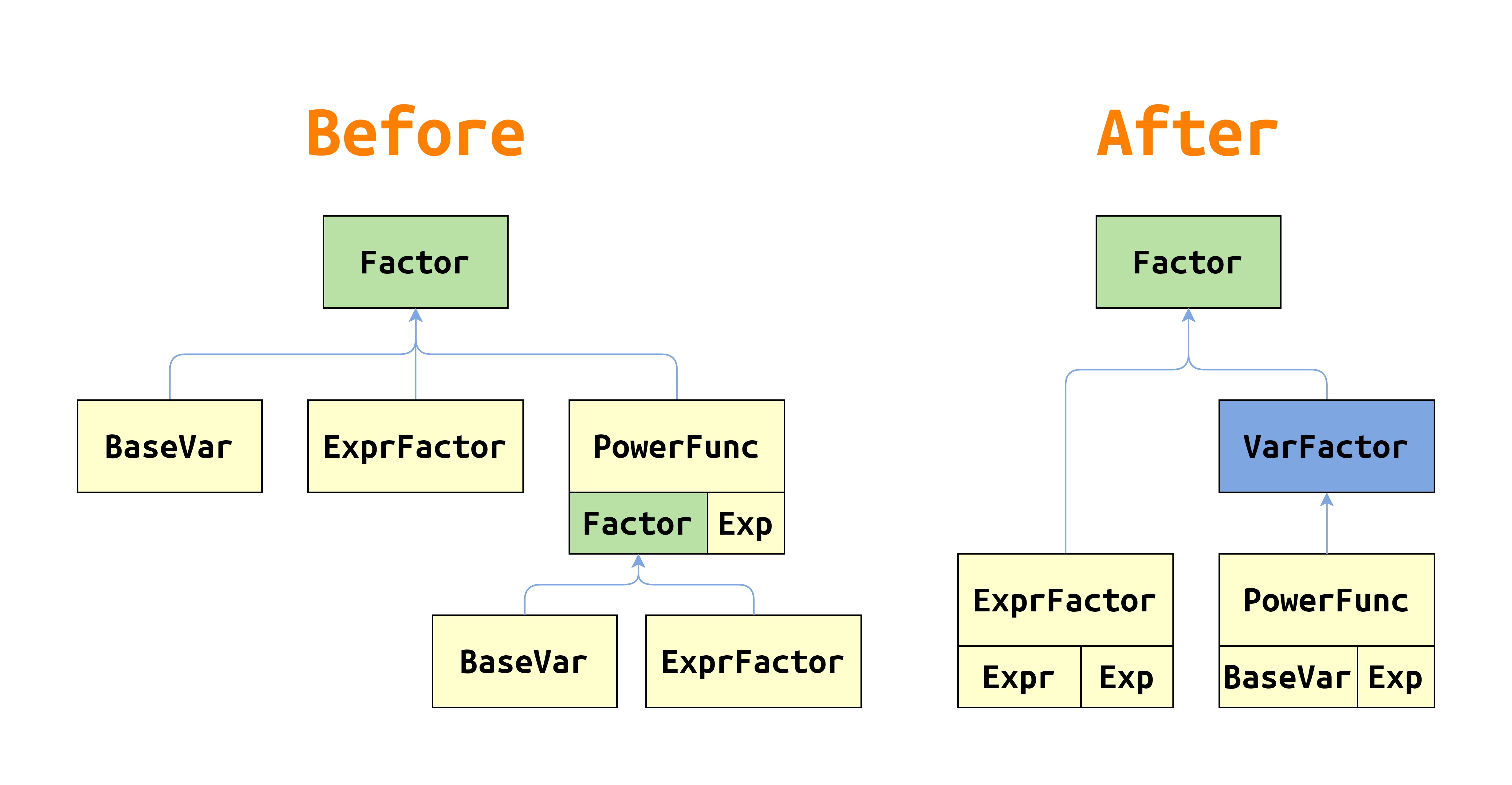 通过采用先导课的递归下降设计,第一次作业的难点就主要在于计算与化简的部分了。此时我们埋下了直接导致需要重构的第一个雷,对于幂函数的处理,我没有完全参照形式化表述的思路,而是单独设计了一个类来表示幂函数,并于计算时再具体展开。