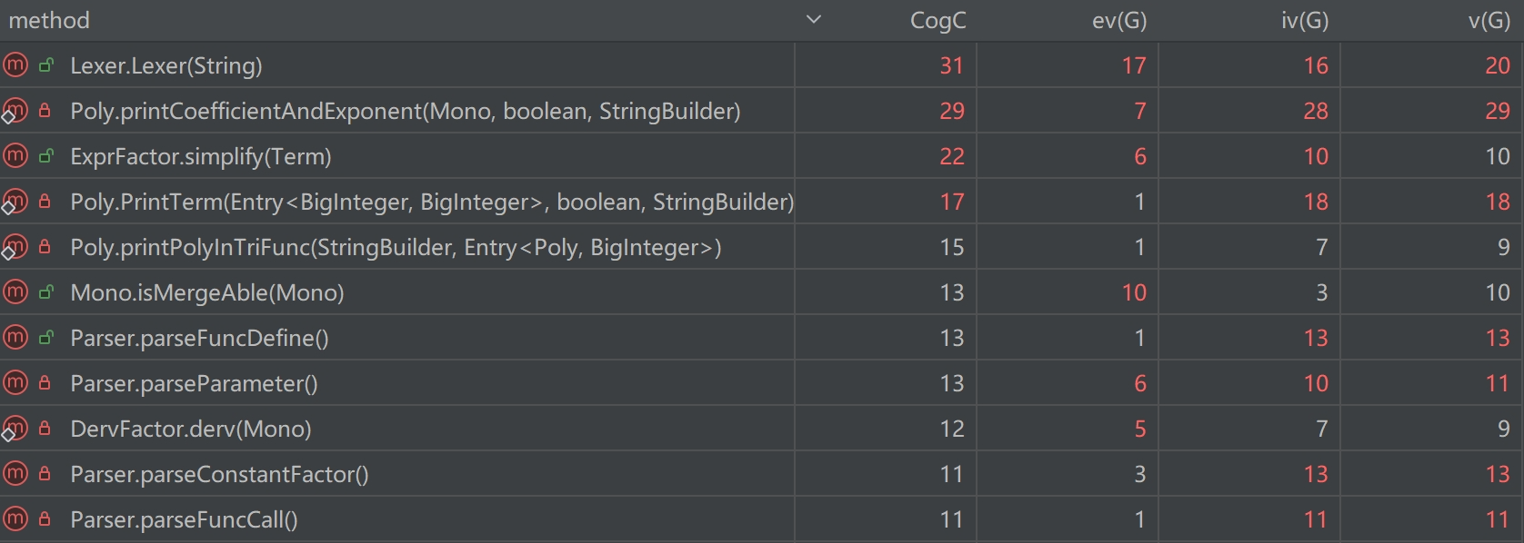 这几个在主线中实现了相当一部分功能的类,因为把大量的重复性功能藏在一个类甚至一个方法内部实现(例如Lexer的大量if-else出现了控制分支数目大的问题),出现了耦合度过高、可读性差的问题。